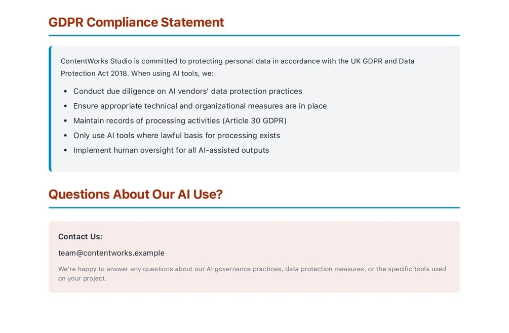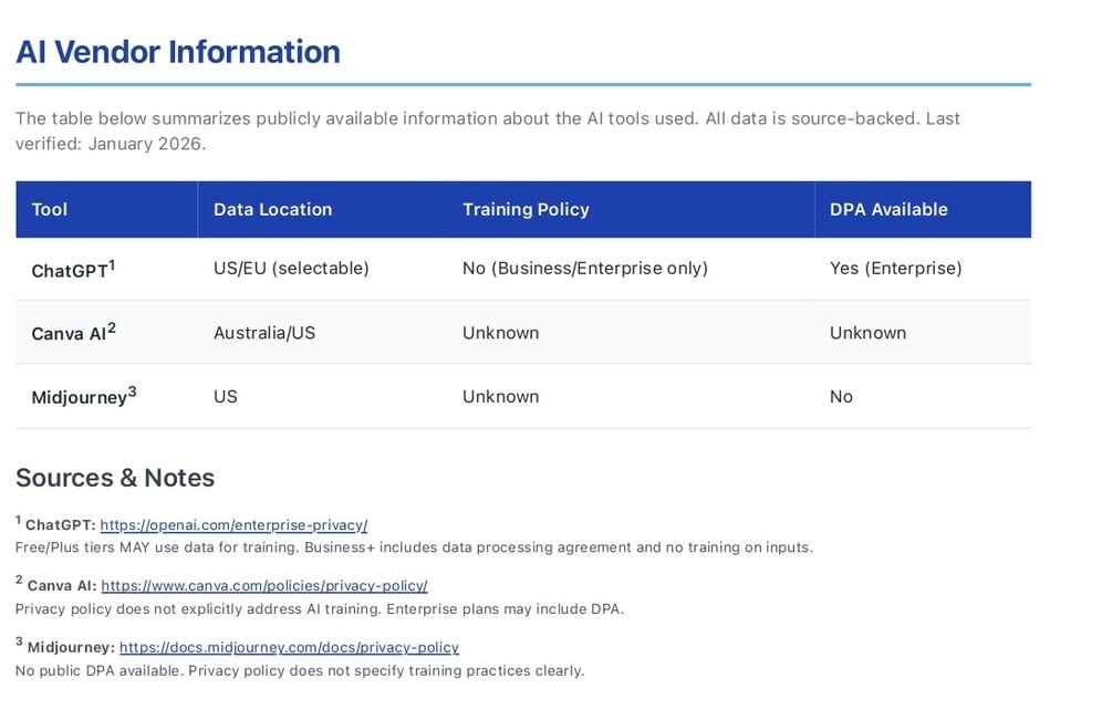 If a client asks: “What AI did you use? Did you upload our data? Is this compliant?”