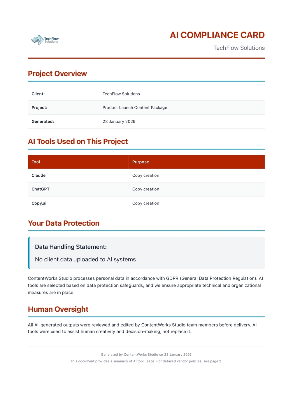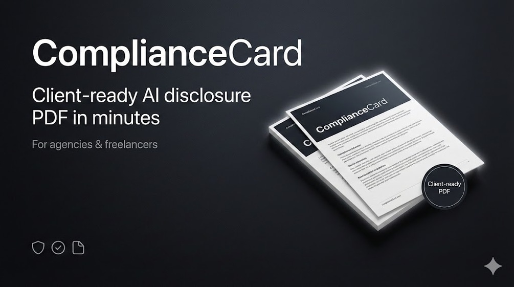 Generate a client-ready AI Disclosure / Compliance Card PDF in minutes — for agencies and freelancers delivering work with AI tools.